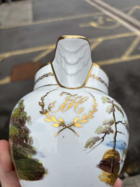 painted to either side with a landscape, gilded initials in a laurel wreath to the front, gilt borders. 14cm high