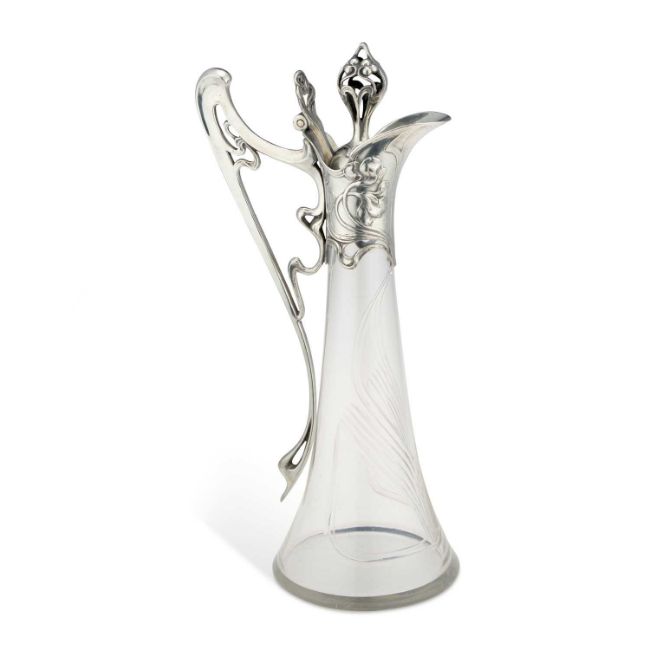WMF (WÜRTTEMBERGISCHE METALLWARENFABRIK) A JUGENDSTIL SILVERED METAL AND GLASS CLARET JUG, CIRCA 1900